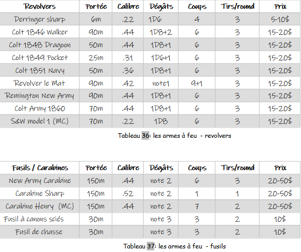 Note1: the Le Mat revolver does 1D8 damage; it has a second barrel below the main barrel that fires grapeshot and does 2D8 damage at 0-10m; it's a rare pistol that can't be bought.