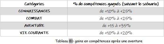 Chaque personnage gagne des pourcentages dans les 4 catégories de compétences. Ces pourcentages sont précisés dans le scénario.