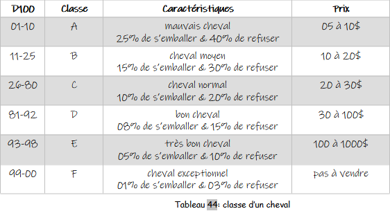 Cheval de classe F : le cheval de classe F est un cheval exceptionnel que l’on ne trouve pas à vendre. Il doit est considéré comme une récompense lors d’une aventure. Ce cheval, rapide comme l’éclair, est aussi apte à subir un dressage qui le rendra docile et obéissant. Il accourra lorsqu’on le sifflera, désarçonnera un autre cavalier sur ordre de son maître etc … Pour dresser ce type de cheval, il faut réussir un jet avec 1D100 sous la compétence « connaître les chevaux ». On ne peut essayer de dresser le cheval qu’une fois par mois et si l’on s’en occupe un minimum de 4 heures par jour.