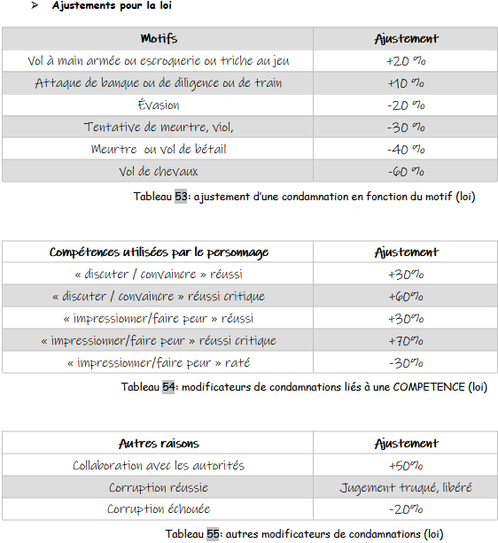 Avant d’effectuer le tirage avec 1D100 pour connaître la condamnation du personnage (cf. tableau 57), le MJ doit commencer par calculer les ajustements de ce tirage, en utilisant les tableaux pour la loi ou pour l’Armée. Tous les ajustements sont cumulables. Ces ajustements correspondent à des circonstances atténuantes ou aggravantes retenues par le Juge (tableaux 51 et 54) ou à des actions entreprises par le personnage pour sa défense (tableaux 52, 53, 55 et 56).