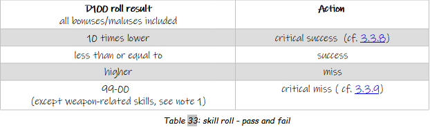 The table below summarizes the results of a 1D100 roll under a skill, and determines whether the action is successful, critically successful, unsuccessful or critically unsuccessful.