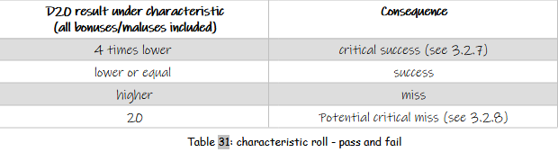 The table below summarizes the results of a 1D20 roll under a characteristic and determines whether the action is successful, critically successful, unsuccessful or critically unsuccessful.