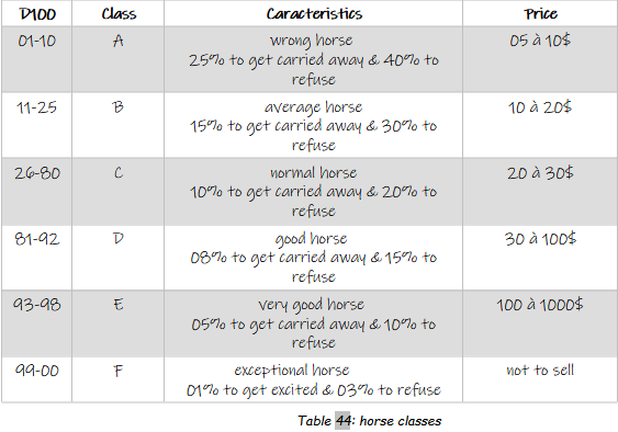 F-class horse: the F-class horse is an exceptional horse that cannot be found for sale. It should be considered as a reward during an adventure. This lightning-fast horse can also be trained to be docile and obedient. It will run when whistled at, unseat another rider on its master's command, etc. To train this type of horse, you need to pass a roll of 1D100 under the skill "knowing horses". Training can only be attempted once a month, and for a minimum of 4 hours a day.