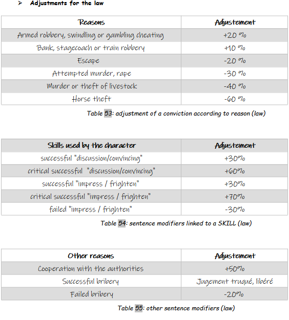 Before carrying out the 1D100 draw to determine the character's sentence (see table 57), the GM must first calculate the adjustments to this draw, using the tables for Law or Army. All adjustments are cumulative. These adjustments correspond to extenuating or aggravating circumstances selected by the Judge (tables 51 and 54) or to actions taken by the character in his defense (tables 52, 53, 55 and 56).