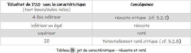 Le tableau ci-dessous résume les résultats d’un jet avec 1D20 sous une caractéristique et détermine si l’action est réussie, réussie critique, ratée ou ratée critique.