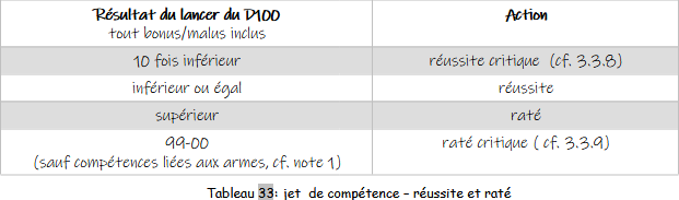 Le tableau ci-dessous résume les résultats d’un jet avec 1D100 sous une compétence, et détermine si l’action est réussie, réussie critique, ratée ou ratée critique