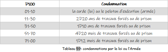 Quand le MJ a effectué tous les ajustements (pour la loi ou pour l’armée), il lance un 1D100 pour définir la condamnation du personnage :